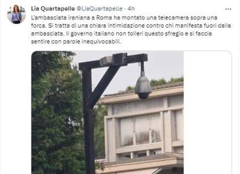 (Adnkronos) – “L’ambasciata iraniana a Roma ha montato una telecamera sopra una forca. Si tratta di una chiara intimidazione contro chi manifesta fuori dall’ambasciata. Il governo italiano non tolleri questo sfregio e si faccia sentire con parole inequivocabili”. Lo scrive su Twitter Lia Quartapelle, vicepresidente Pd in commissione Esteri di Montecitorio. La telecamera sarebbe posizionata vicino alla recinzione che si affaccia su via Nomentana.