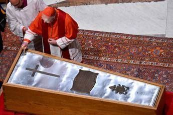 Il rito, come ha disposto lo stesso Pontefice, è stato più snello. Non più tre bare, come era consuetudine: utilizzata un’unica bara in legno rivestita di zinco. Prima della chiusura della bara, il volto di Francesco è stato coperto da un velo di seta bianca e all’interno della cassa è stat collocata una borsa con le monete coniate durante il pontificato, delle medaglie d’argento e di bronzo a simboleggiare gli anni di servizio. Nella bara è stato anche posto un tubo di metallo contenente il Rogito, redatto dal maestro delle cerimonie, nel quale si racconta la vita del Papa.